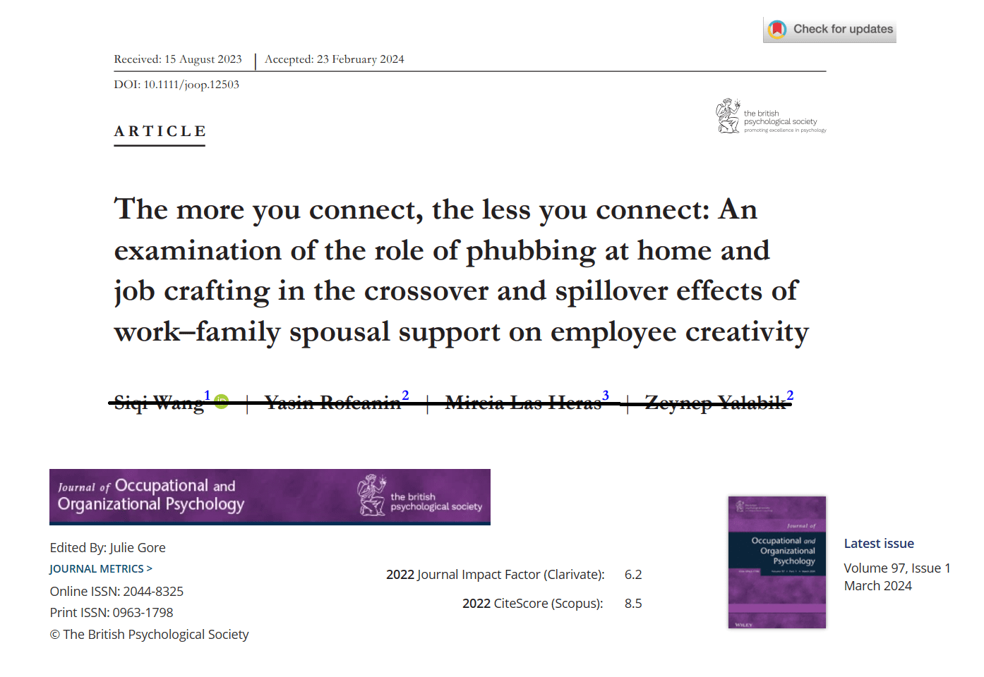 spillover effects of work–family spousal support on employee creativity” published in Wiley’s Journal of Occupational and Organizational Psychology (Clarivate SSCI Impact
