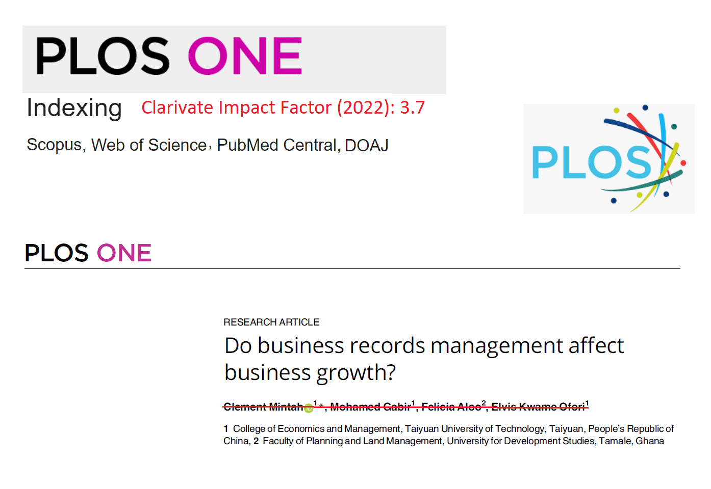The article “Do business records management affect business growth?” by Mintah et al. (2022) was published in PLOS ONE which is a journal indexed by Clarivate Analytics (SCIE/IF 2022: 3.7),